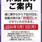 今年の桜は木を大幅に切った為、去年と比べて寂しいですが、お客様のご要望により女性露天風呂の桜ライトアップを開始 […] - 休館日のご案内(2026年5月11日)